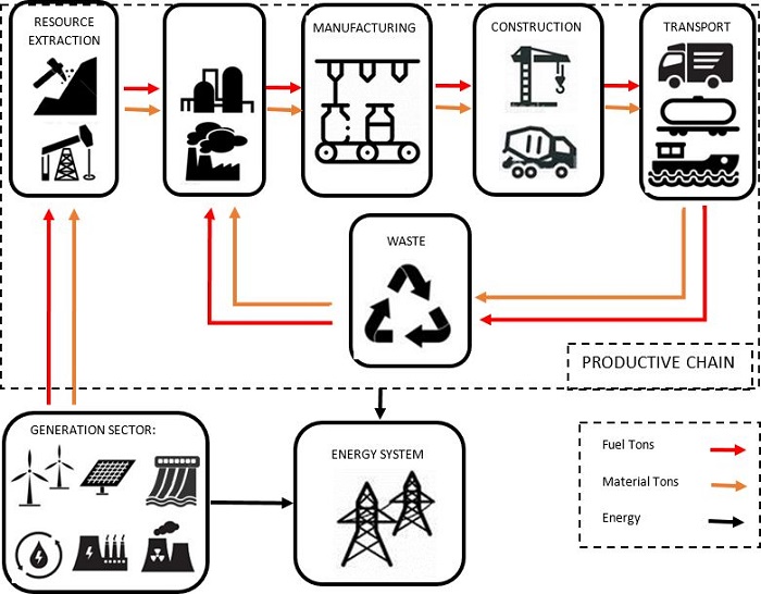 Figure 1 shows the schematic diagram related to the operation to determine the most satisfactory scenario of investment allocation of power energy. A computation of materials necessary to build the generation source is carried out, including the generator, infrastructure and complementary equipment. In turn, the type of fuel (fossil, nuclear, organic, etc.) and its quantity are determined. From there, the energy calculations of each stage considered of the life cycle are made. Each stage has a certain performance, associated time, energy cost and waste. Waste contemplates the production chain of materials and fuel. Nuclear waste is considered in the production chain and, therefore, the necessary energy. The transport sector is distributed in the production chain, however, and for simplicity, it was drawn as another stage.
