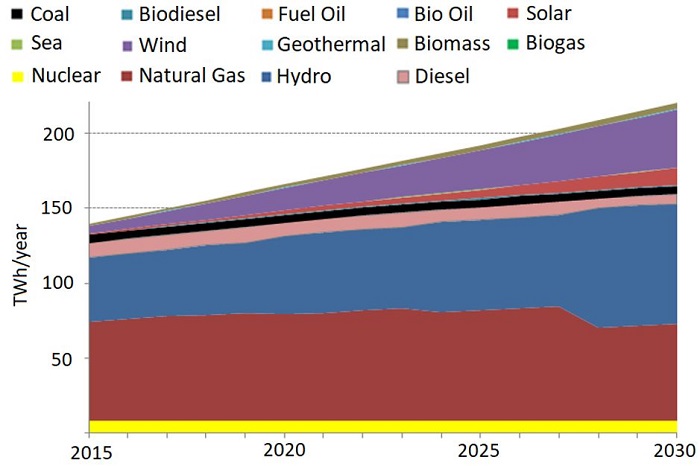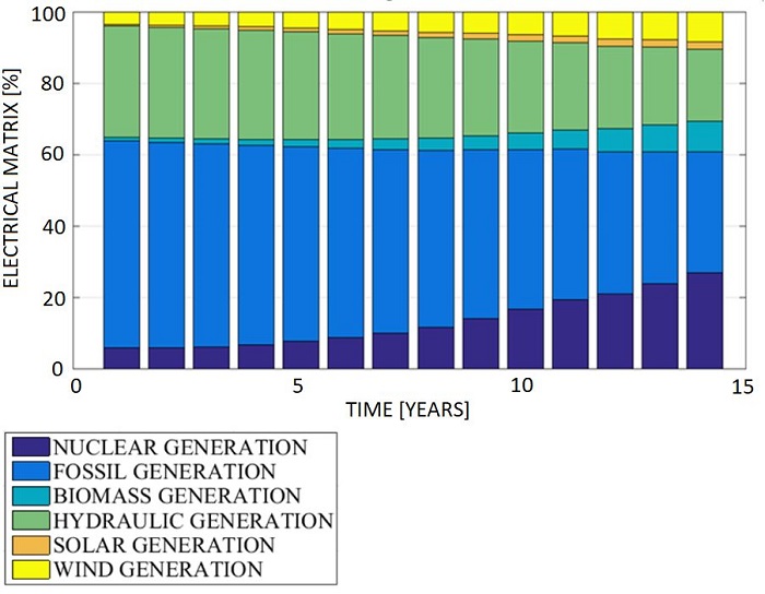 The proportion of nuclear, wind and biomass generation favors a sustainable electricity matrix. The scenarios based on nuclear generation were those that obtained the best results, followed by wind and biomass generation. The investment in hydraulics has high associated investment costs, together with its associated time, makes it inconvenient. The scenario with investment in Fossil was the least satisfactory regarding emissions, which is logical. The optimal composition of renewable energies (Solar, Wind and Biomass) reaches the target of 20%, and considering the hydraulic energy, this reaches the third part of the Electrical Matrix;