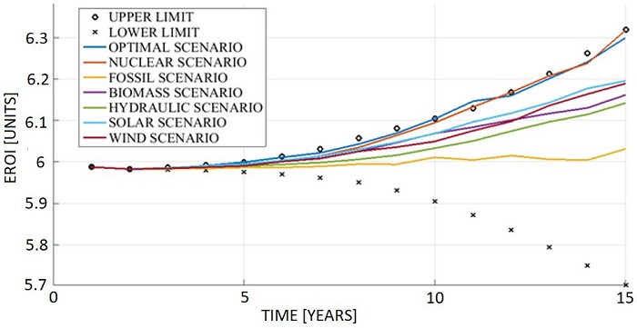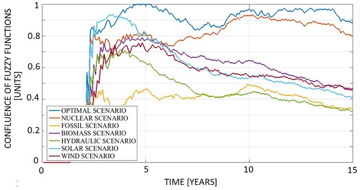 Figure 4 shows the EROI graph for each type of scenario studied and the upper and lower limits used for fuzzy functions. It is observed that the scenario with the lowest global energy profitability corresponds to that of Fossil Scenario, which remains approximately constant. Additionally, in this scenario the best EROI was obtained by building nuclear generators. Biomass generation has interesting characteristics, such as security of supply, provided that the availability of the input is guaranteed and an intermediate EROI. It is observed that the most favorable in the very long term (10 to 15 years) is the transition towards nuclear energy which have the best EROI and service safety.