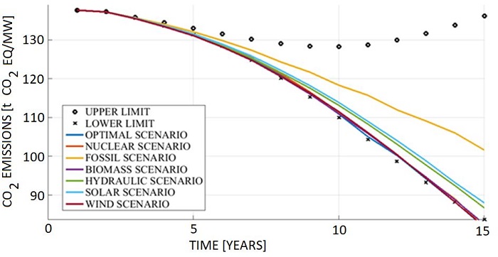 Figure 4, Figure 5, Figure 6 and Figure 7 show the EROI, Emissions and Economic cost vs. time, respectively. In these graphs, the upper and lower limits that build the fuzzy indices are shown. In cases where the indices must be maximized (EROI and RP), the upper limit constitutes the values of full satisfaction and vice versa for the lower limit. In cases where the indices must be minimized (CO2 and COST), the lower limit constitutes the values of full satisfaction and vice versa for the upper limit. This case is valid for any assigned weight. The intermediate values correspond to a level of satisfaction intermediate between zero and one, depending on the assigned exponential weight.