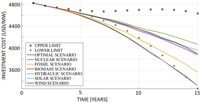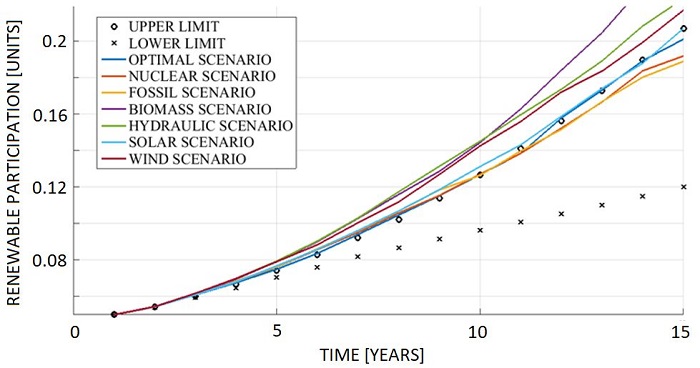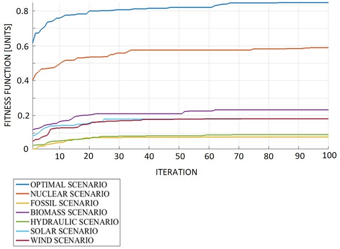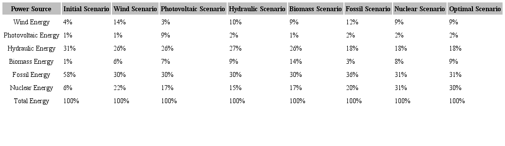 Table 3 presents the initial and final composition (for each scenario) of the electrical matrix according to the sources used. Each of them was optimized using the same procedure, limiting the search space in order to favor their assignment. In their respective favorable scenarios, the following variations are observed: Wind Energy (from 4% to 14%), Photovoltaic Energy (from 1% to 9%), Hydraulic Energy (from 31% to 27%), Biomass Energy (from 1% to 14%), Fossil Energy (from 31% to 36%) and Nuclear Energy (from 6% to 31%). Additionally, Wind, Photovoltaic and Biomass Energy grow considerably in their favorable scenarios.