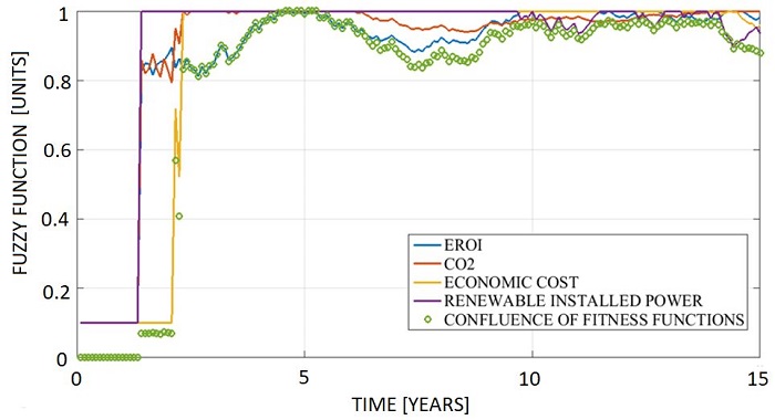 Indices are constructed from the proposed mathematical growth model. These indices correspond to the systemic EROI, which is calculated from the EROI of each generator, CO2 emissions, Investment Cost (COST) and the proportion in renewable energy (RP). These indices are transformed to the fuzzy domain and weighted by exponential weights, which are obtained from the AHP. Additionally, for the assembly of these indices, limits of dis/acceptance of the same are needed. These are obtained from extremely unfavorable scenarios. Finally, the intersection of these fuzzy indices are carried out by means of the t-norm. This operator allows to build an aptitude function obtaining (at most) the worst diffuse index obtained. Algebraic product is used, which is one of the t-norms that is continuous and, additionally, it is one of the less strict (this can be developed in future work).
