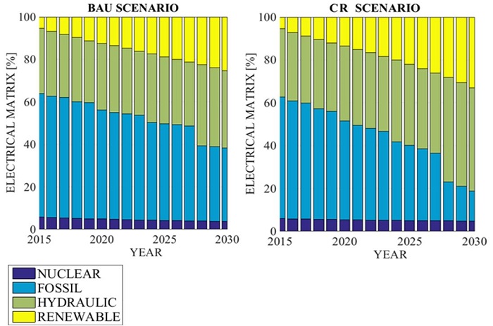 3 shows the composition of the electrical matrix in the BAU and CR scenarios. Currently, the Argentine Primary Energy Matrix is predominantly composed of fossil fuels (see 3) and presents two peculiarities: the high contribution of natural gas (54%) and the very low participation of mineral coal (less than 1%). There is a high and growing dependence on fuels, as a result of generation dispatch with a growing fossil predominance and high inefficiency in transportation systems. The current construction of gas turbine plants, combined cycles, etc., decreases the import of electrical energy, but increases the import of these fuels, and therefore the total balance is not improved. The CR (see 3) scenario seeks a more drastic reduction in fossil fuels than the BAU scenario. However, neither of the two scenarios contemplates a growth in nuclear energy.