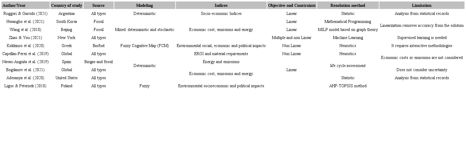 Table 1 shows a summary of the present proposals with: country of analysis, sources analyzed, linear or non-linear modeling, type of uncertainty, resolution methodology and limitations. Most of the important published works are carried out using deterministic models, or in the best of cases, mixed with stochastic models. That is, they use classical models of mathematical programming, which have limitations in their formulation and quality of the results obtained. No important studies were found on the energy transition applying the EPSO metaheuristic. It is also observed that there are few studies that involve all the different types of generation sources.