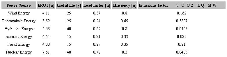 The EROI is a good indicator of energy efficiency and sustainability, since it encompasses the energy cost-benefit and can be used to estimate the economic cost and emissions. These are determined by installed power, load factor, useful life, performance, emissions factor, and discount rate;