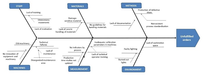 Increase in defective products and Excessive time in movement of people and material. Cause 1 is defined as the pairs of shoes that do not allow to cover the estimated demands in the required days, which generates several unmet orders. In relation to cause 2, it was defined that there is a deficient allocation of areas within the operations yard, this generates several unnecessary movements that causes lost time that could be used to produce more shoe products.