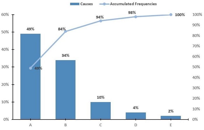 These causes are measured by an economic weighting to know which are the most influential regarding the problem and the company, resulting in 80% of the problems being concentrated in causes A, B and C.