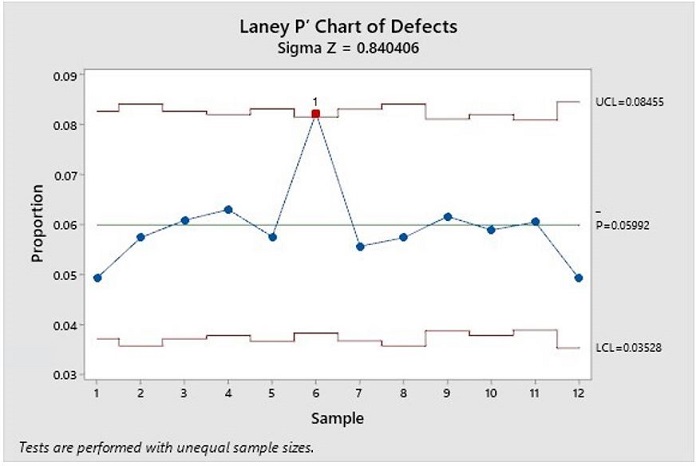 To be able to cover this cause, it is important to know if our process is out of control or not, for this reason we choose to carry out a general demonstration and rely on statistics with a control graph, which is evidenced in Figure 7 with Laney's P' Defect Table. The graph below shows us that the process is not out of control since there is a point that exceeds three standard deviations from the center line. (Pérez Bernabeu& Sellés& Gisbert, 2012)