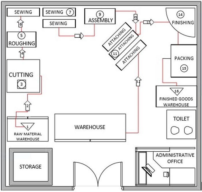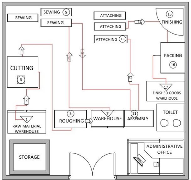 The work areas are arranged according to the sequence of operations so that there is continuous flow of materials without congestion (principle of flow).