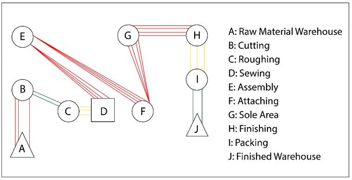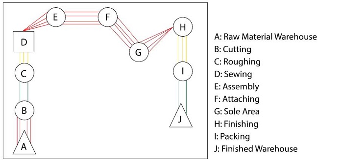 Based on the data collected and the analysis of the activity, the spaghetti diagram of the current design is designed. Regarding the most significant contribution, the authors designed an optimized plant layout and added a rail in the operations area to facilitate the shoe assembly sequence. Tarigan and Ishak indicates that redesigning the layout can reduce the waiting time of service process. In that case, displacement was reduced in 64%. Respect the time of service, this was reduced in 22% (Tarigan et al., 2020).