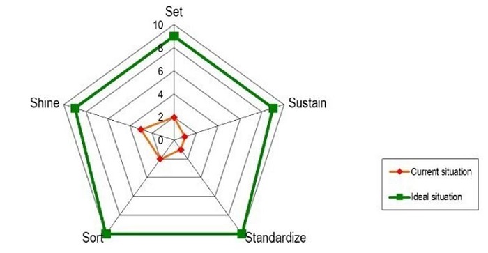 Sayid and Nurh pointed out that, the 5S method constitutes one of the most effective tools for continuous improvement, since it is the basis for reducing activities that do not add value. In a production process line, a good change or improvement can be achieved in many ways, such as reducing inventory, production time, defective parts, etc. The implementation of the 5S methodology consists of teamwork, training work, reaching multiple skills and a learning environment (Sayid Mia et al., 2017a).