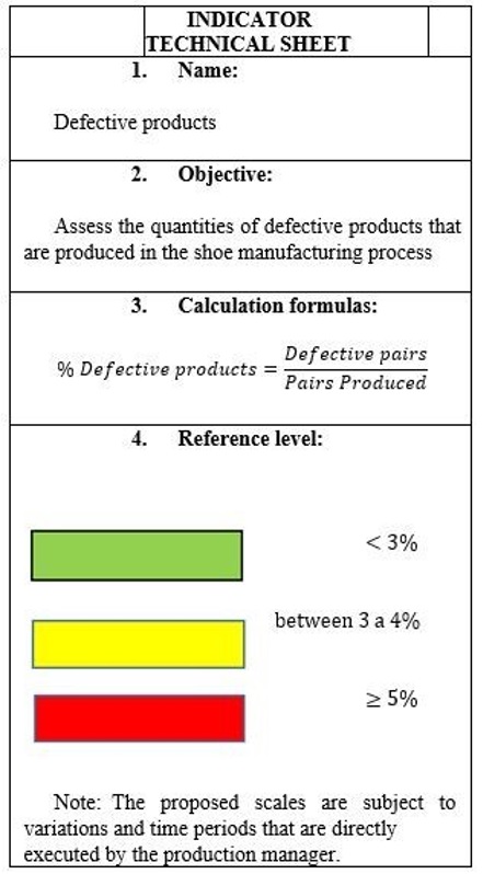 The secondary objectives are related to the causes identified in the previous point, where different indicators associated with each of them were calculated. Regarding cause one, the indicator of defective products was calculated, where a current value of 6.22% was obtained, in which a reduction to 4% is proposed. Another important indicator linked to cause 2 is productivity, which proposes an increase of more than 30% also the current cycle time that the company manages for the elaboration of a pair of shoes was evaluated, where a decrease was estimated of the time in 30% with respect to the current of 15.94 min per produced pair.
