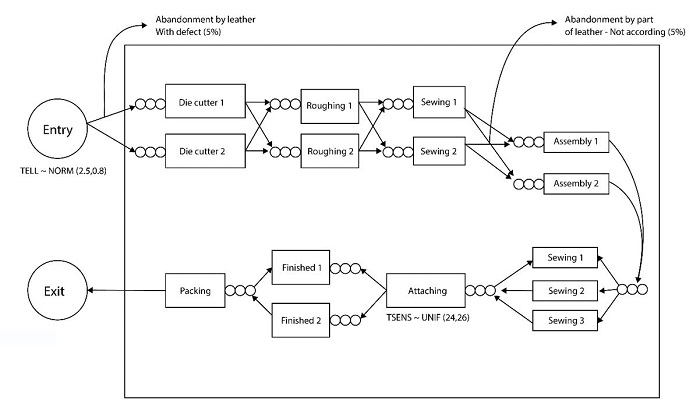 The simulation represents the entire system of the shoe manufacturing process at company. It begins with orders arriving at the system and ends with the boxing the final product.