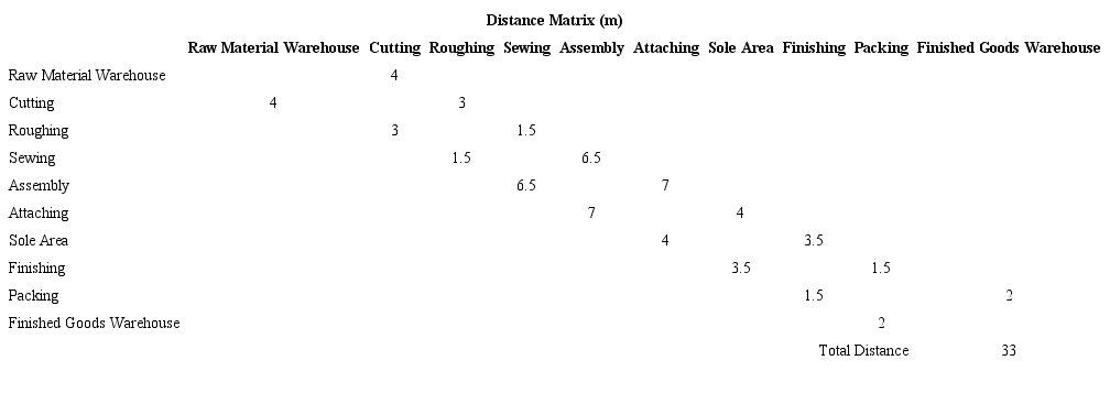 The application of the plant distribution proposals helped increase the company's productivity by 38% and the total movement of material decreased by 14%. Travel distances are reduced from 174m to just 29m in total. Similarly, the production process times were reduced by 33%. This increased production with an additional 10,000 pairs per year, allowing the company to complete all previously unfulfilled orders and create a lead opportunity. In a textile manufacturing company, Rabanal pointed out that, the application of the SLP methodology helped to reduce cycle times, this was reduced from 138.74 minutes to 120.46 minutes and the distance travelled in the operating yard was reduced from 87.50m to 39m (Rabanal et al., 2020).