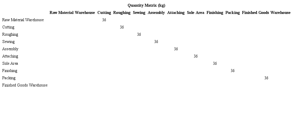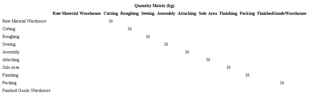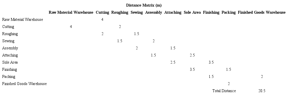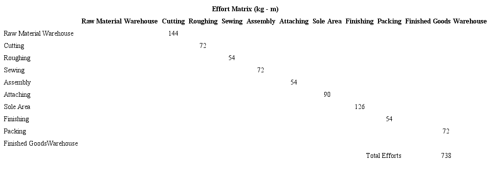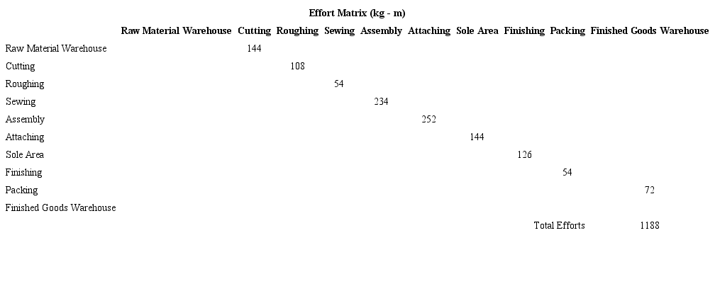 Then matrix Tables 5, 6, 7, 8, 9 to 10 of Distance (m), Quantity (kg) and Effort (kg-m) are prepared in which the current plant distribution and the distribution proposal are considered.