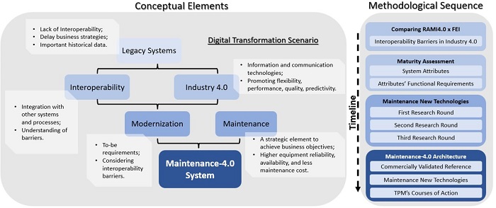 Disruptive ICT's promote escalating industrial productivity, putting current economic models in check, fostering the growth of industrial organizations, change the profile of the workforce, and ultimately increase the competitiveness of companies (Rüßmann et al., 2015). Thus, the proximity with the term interoperability is evident because of the prominence of such technologies, which will increase the collaboration between systems, machines, and people; that way, enabling greater speed, flexibility, and efficiency in production processes, resulting in higher quality at reduced costs (Carvalho et al., 2018; Gallegos-Baeza et al., 2021; Kozma et al., 2021; Tao & Qi, 2019). Aiming this scenario, the research presented here proposes a series of MCDM methods, encapsulated as a framework, to support strategic decisions to adequate legacy systems to Industry 4.0. This is done focusing on interoperability. As result, technologies will be suggested for implementation, regarding the analyzed system's specificities and background in which it performs. Narrowing the range of technologies to be proposed, consequently being more assertive, this work highlights systems in the context of industrial maintenance. Figure 1 describes the connection between the research dimensions in this scientific scenario and the research’s methodological sequence.