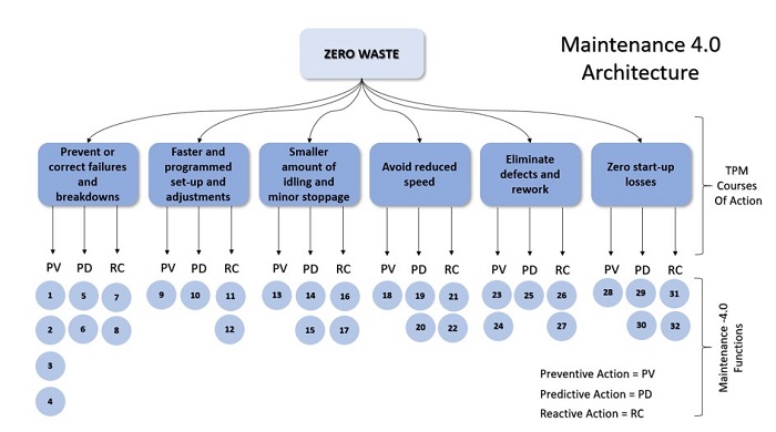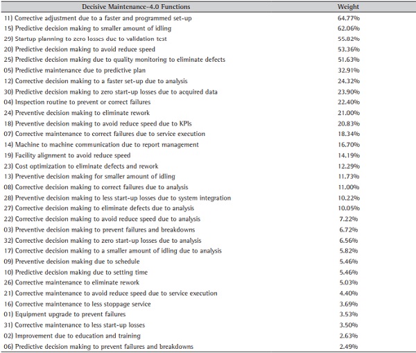 At this stage, another questionnaire, now based on the Figure 7 model, reflects Maintenance-4.0 expectations. It presents decision-makers a series of maintenance functions and their application in the light of I4.0. Based on the TPM's six main losses, the engineers and maintainers must consider their decisions regarding predictive, preventive, and reactive approaches that will guide maintenance processes to zero waste. At the end of this step's comparison, each function of the Maintenance-4.0 model is ranked by weight.
