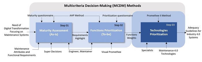 The framework proposed in this article is structured in three steps. In Step 01 the AHP method is used to assess the organization’s maturity, relating the I4.0 attributes and requirements in a maintenance bias. Step 02 is also built for the application of the AHP method, which will provide the allocation of weights for functions of a Maintenance-4.0 referential architecture, giving a selection of the most needed ones. Finally, at Step 03, the PROMETHEE II method will be applied to prioritize the technologies that will best adapt to the functions selected in the previous step Figure 5.