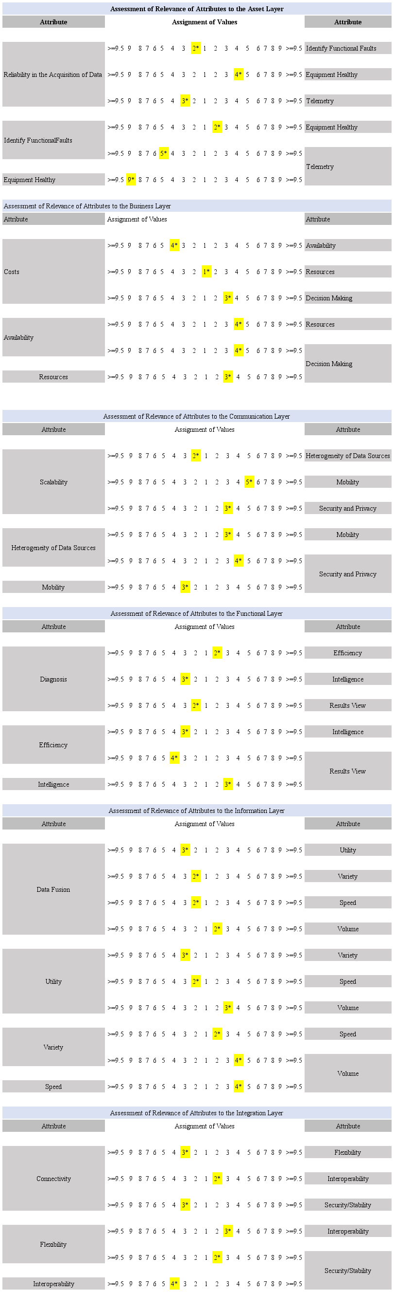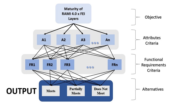 The name of the analyzed layer will be located at the top level of the decision model, representing the model’s objective. The intermediate level will consist of attributes and functional requirements belonging to the industrial maintenance domain, distributed among the six layers to be analyzed. In the end, the lower level presents the alternatives: meets, partially meets, and does not meet; related to each functional requirement of the intermediate level. The relation attributes/requirements qualify the analyzed system (Justus et al., 2018).