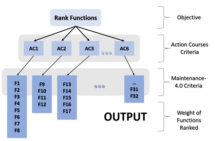 The 32 maintenance functions are ordered according to their respective weight in Table 4, resulting from the normalization of the AHP method (seen in Figure 7). The overall course of action comparison was acceptable with a Consistency ratio: 0.04973.