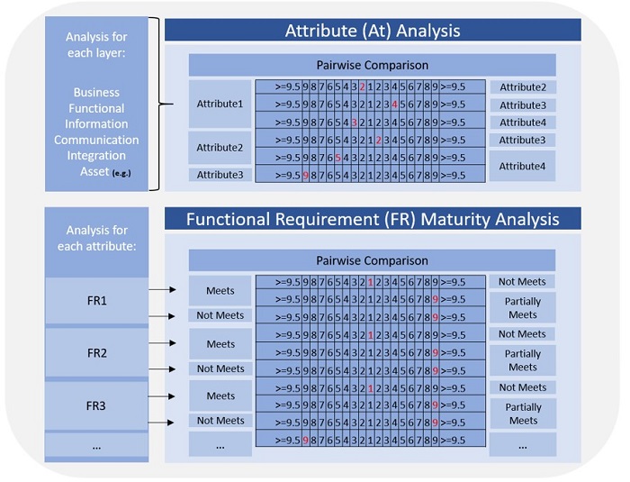 Before this decision support method, a questionnaire aims to answer the importance (i.e., weight) of the elements to be raised. This is done based on the know-how of the chosen engineers and maintainers. Then, performing the AHP's peer review, the three alternatives are ranked, thus providing the result of the maturity assessment for each layer of RAMI4.0/FEI. When all six layers are evaluated, it will be possible to obtain the degree of maturity related to the requirements of Industry 4.0.