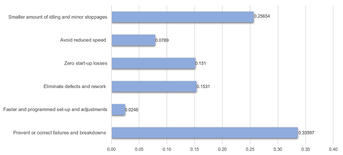 Various concepts have been developed to increase maintenance effectiveness. One of the most commonly used concepts in organizations around the world is Total Productive Maintenance (TPM). The TPM emphasizes proactive and preventive maintenance to maximize the operational efficiency of the equipment. Production losses, together with indirect and hidden costs, make up the bulk of the total production cost (Kodali et al., 2009). Developed to support TPM initiatives, Overall Equipment Effectiveness (OEE) is a metric that identifies the percentage of planned production time that is truly productive. The OEE loss of availability, loss of performance, and loss of quality can be subdivided into what is commonly called TPM Six Big Losses (Vaisnys et al., 2006), the most common causes of lost productivity in manufacturing.