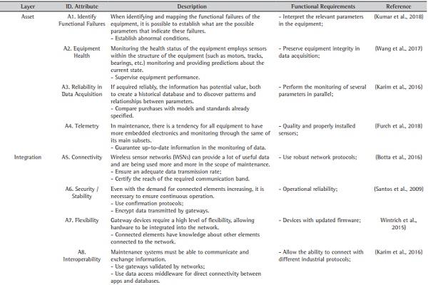 The purpose of the attributes is to qualify maintenance within the RAMI4.0 layers. Using the Assets layer as an example, the attributes raised have a bias to guarantee the functionality of the acquisition system and to ensure the quality and the way that the sensing in the equipment is carried out. In the case of functional requirements, they must support the attributes, so that they are met. Again, using the Asset layer as an example, the functional requirements are related to the needs of a good sensing system, what should be sensed and what these sensors should monitor. Table 1 presents all 25 attributes raised in the literature and their descriptions, follow by the 62 functional requirements derived from the attributes, therefore using the same literary base indicated by the ID column.