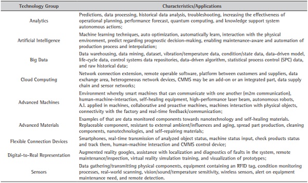 Finally, in the third round, the technologies highlighted for the industrial maintenance were filtered and allocated into groups. The whole literature database ended with 69 articles and reports. From it, nine Maintenance-4.0 technology groups were identified: Big Data, Analytics, Artificial Intelligence and Cloud Computing, formalized as cyber-physical subgroup; Advanced Machines, Advanced Materials, Flexible Connection Devices and Digital-to-Real Representation (i.e., encapsulating Digital Twin applied in maintenance activities), formalized as application subgroup; and Sensors (i.e., encapsulating IoT and Smart Sensors, formalized as the bridge to digitalize physical operations). Table 3 details each group.