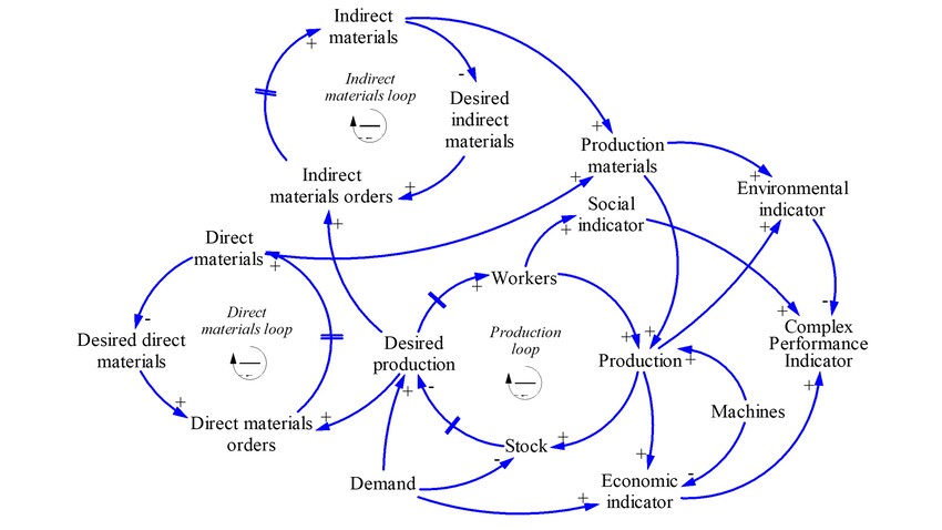 The first two are the direct and indirect materials loops that control the essential and auxiliary elements for manufacturing the products. An increase in the desired production results in increased orders of either or both groups of materials, subject to revision of inventory levels and safety stock. After delays due to delivery, the inventory of either or both groups of materials increases. These loops affect the behavior of the environmental indicator. The third loop is the production loop that controls increases in the desired production. An increase in demand increases the desired production, subject to inventory levels and safety stock, which in turn triggers a request to modify the number of workers hired within a time frame. The production volume is related to each worker's productivity, and it is measured as the number of units produced per unit of time. Production volume increases the stocks of the final product, which decreases as orders are dispatched. This loop affects the social indicator through the workers’ behavior and the economic and environmental indicators through the dynamics of production.