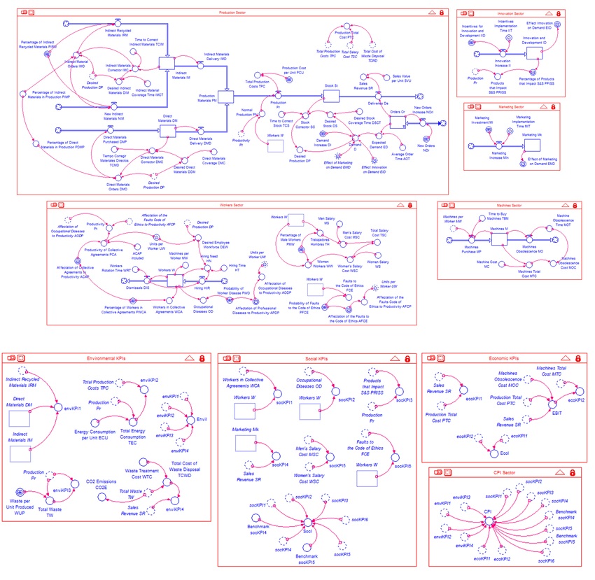 Through the model, given some initial conditions, planning horizon, and average demand growth, it was observed that environmental performance can be improved through the implementation of innovation strategies. If demand is growing at an above-average rate, environmental performance can be improved through the combination of innovation and marketing strategies. On the other hand, social performance can be substantially improved under diverse conditions by implementing strategies that increase worker welfare and equity in hiring both men and women. Production strategies, such as lowering costs and increasing the usage of recycled materials improved the economical performance under average demand growth conditions. However, with above-average growth, the implementation of production, marketing, and innovation strategies did not provide a substantial increase in economic performance. Finally, analyzing the sustainability performance in aggregate, the improvement of working conditions, and reduction of waste had the most impact throughout the planning horizon. However, with above-average growth, the implementation of production, marketing, and innovation strategies had the largest effect on aggregate performance.