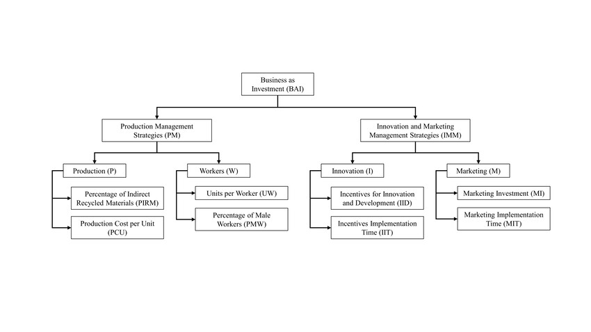 Business as Investment (BAI) considers increased levels of investment through production management (PM) and innovation and marketing management (IMM) strategies. Figure 4 illustrates the variables in the system modified in this scenario. PM strategies affect both the Production (P) and Workers (W) sectors. For sector P, Percentage of Indirect Recycled Materials (PIRM) increases by 5% per option, and Production Cost per Unit (PCU) decreases by 2.5%. For sector W, Units per Worker (UW) increases by 2.5%, and Percentage of Male Workers (PMW) decreases by 2.5%. IMM strategies affect both the Innovation (I) and Marketing (M) sectors. For sector I, Incentives for Innovation and Development (IID) increases by 5% and Incentives Implementation Time (IIT) decreases by 5%. For sector M, Marketing Investment (MI) increases by 5% and Marketing Implementation Time (MIT) decreases by 5%;