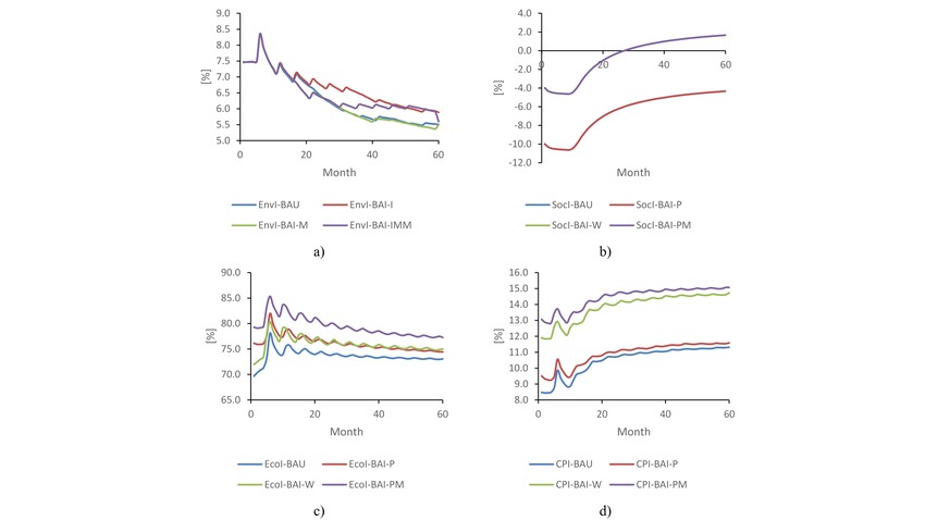 Figure 7 shows the results for the best options for the production management strategies in the BAI scenario. At the end of the planning horizon, EnvI improves 5.1% (from 5.5 to 5.79) when Sector W variables are modified; SocI improves 138% (from -4.3 to 1.65) when Sector W variables are modified or with the combined PM strategies. EcoI improves 2.6% (from 73.1 to 77.21) with the combined PM strategies. Finally, CPI improves 30.6% (from 11.3 to 15.7) with the combined PM strategies. Worker-related strategies have the highest effect on CPI, with minor improvements when combined with production-oriented strategies.