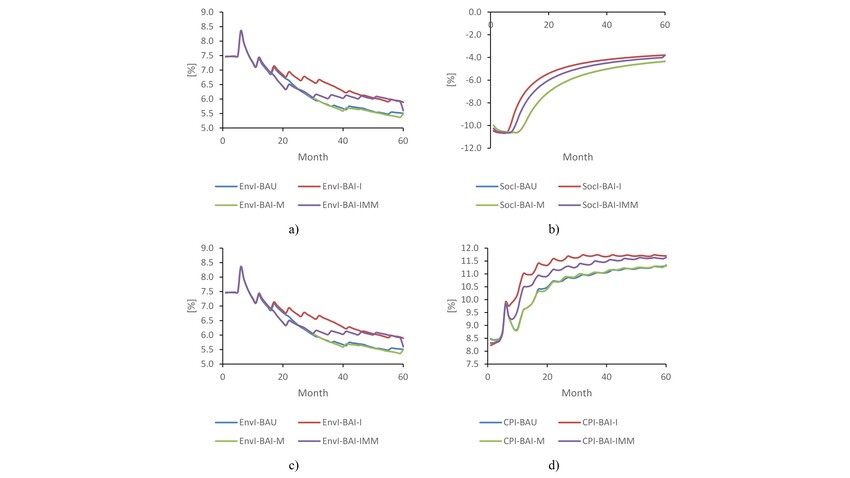 Figure 8 shows the results for the best options for the innovation and marketing management strategies in the BAI scenario. EnvI improves 6.9% (to 5.89) when Sector I variables are modified. SocI improves 12.4% (to -3.80) when Sector I variables are modified or with the combined IMM strategies. EcoI improves 0.3% (to 73.25) when Sector W variables are modified. Finally, CPI improves 3.4% (to 11.7) when Sector I variables are modified, meaning that implementing innovation strategies alone has the necessary effect, and a combination with marketing strategies have a minor additional effect.