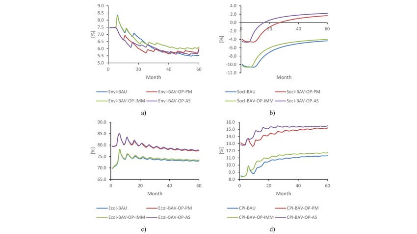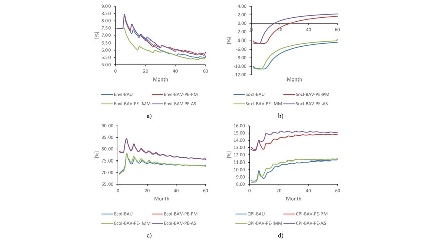 Figure 9 shows the results for the best options for the BAV scenario, considering an optimistic growth in demand. EnvI improves 11.1% (to 6.12) when IMM strategies are implemented. SocI improves 150.7% (to -2.2), EcoI improves 6.4% (to 77.72) and CPI improves 37% (to 15.49) when AS strategies are implemented, meaning that significant effects on CPI are obtained with production management strategies only. Contrary to expectations, innovation and marketing strategies did not significantly improve CPI.