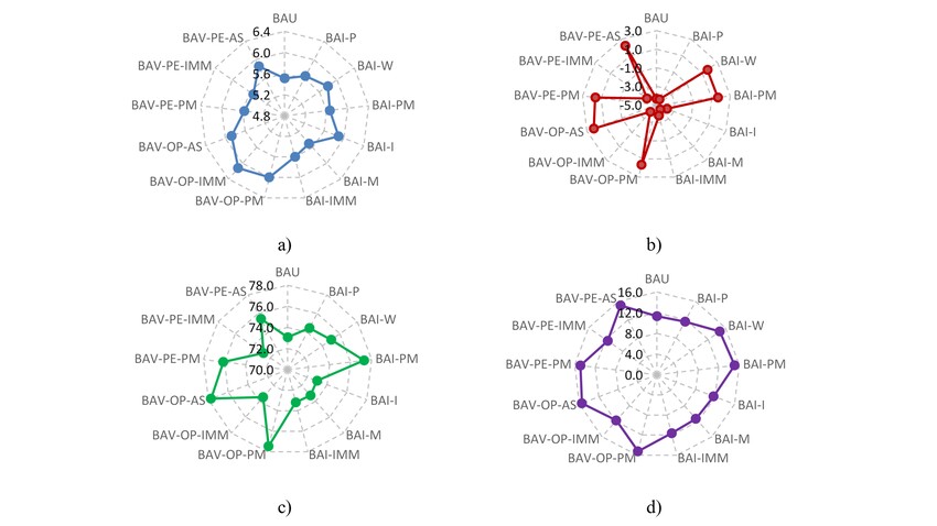 Figure 6 illustrates the results of the BAU scenario, where no strategies have been implemented and demand growth is based on historical performance. As such, BAU is used to compare the results of all other strategies. At the end of the planning horizon, EnvI reaches a value of 5.5, SocI reaches a value of -4.3, EcoI reaches a value of 73.1, and CPI reaches a value of 11.3.
