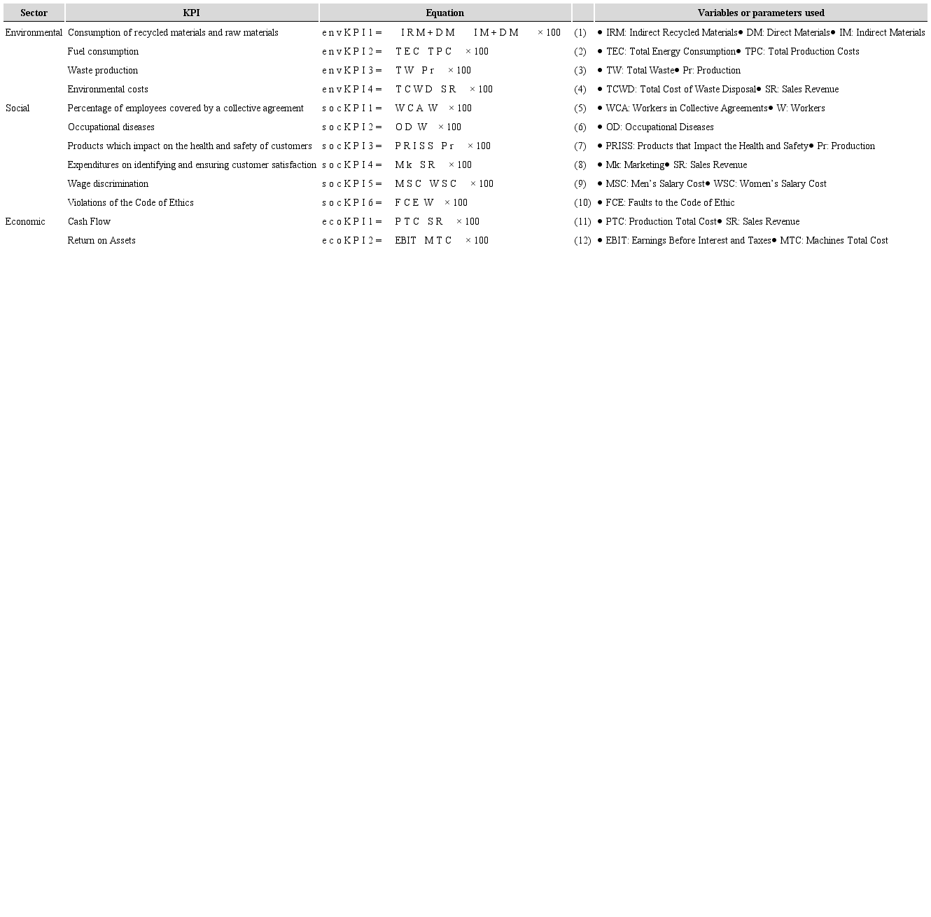 Social KPIs (SocI) measures the proportion of workers in collective agreements, the frequency of professional illnesses, products that impact safety and health, identification of client needs, salaries, and failures in the code of ethics, based on the equations from Table 1;