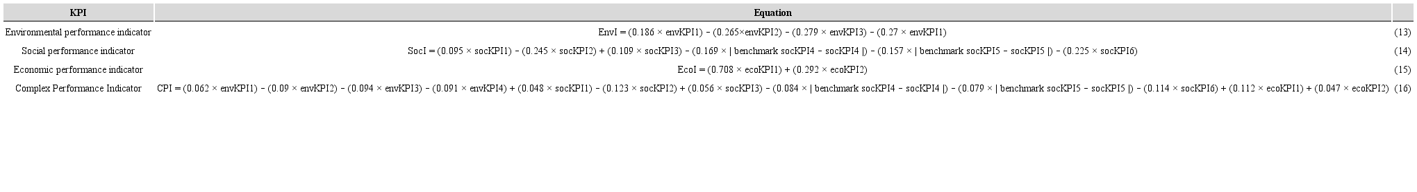 CPI = (0.062*envKPI1)-(0.09*enviKPI2)-(0.094*enviKPI3)-(0.091*enviKPI4)+(0.048*socKPI1)-(0.123*socKPI2)+(0.056*socKPI3)-(0.084*(ABS(Benchmark_socKPI4-socKPI4)))-(0.079*(ABS(Benchmark_socKPI5-socKPI5)))-(0.114*socKPI6)+(0.112*ecoKPI1)+(0.047*ecoKPI2)
