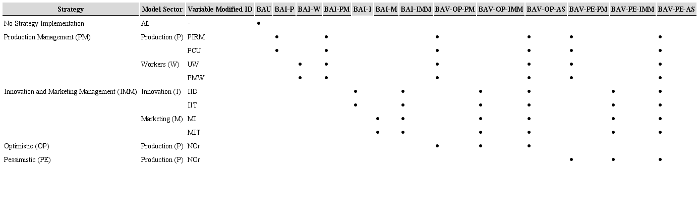Once these tests were successful, the model was checked for robustness and sensitivity using scenario analysis. A scenario is defined as a broad set of initial conditions and changes applied during a simulation to observe the responses of the model, a corporate strategy is defined as a percentage change made to the initial values of one or more variables of the model, and an option is defined as the individual settings of each variable, which are used to observe the behavior over-time of the system KPIs. The analysis focuses on the effects that a corporate strategy implemented by management has on the behavior of the Environmental Indicator (EnvI), Social Indicator (SocI), Economic Indicator (EcoI) and Complex Performance Indicator (CPI), during a five-year planning horizon (in manufacturing planning, a five-year time is considered a long-term period for the decision-making process), assuming initial conditions corresponding to the Colombian manufacturing sector, as mentioned in Section 3.1. The results are reported as the accumulated average of each KPI, aiming to observe convergence at the end of the planning horizon. Moreover, the results are also indicators of the viability of the strategy under those conditions. Table 3. shows three global scenarios and its strategies, which include both increases in investment levels and optimistic and pessimistic changes in demand.