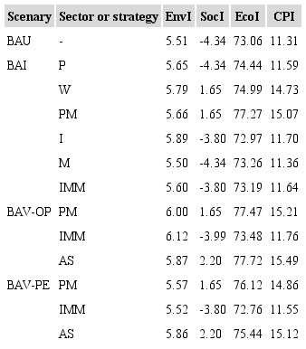Table 4. shows the consolidated results by KPI according to the changes by sector and the implementation of strategies. In boldface are the results with the highest values, which are obtained for the BAV scenario by combining strategies and optimistic demand growth, and for the BAI scenario by applying the PM strategies.