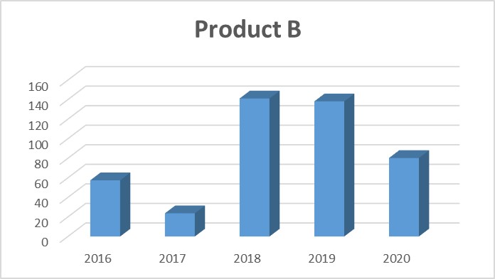 In December 2017, product B had a -59% drop. In 2018, there was a surprising high growth of 495%, and in 2019 and 2020 there was a drop of -2% and -42%, respectively. The company's top management believes that these oscillations are influenced by competitors' actions and the promotional actions carried out to leverage sales in some periods, considering that quality and price are factors that impact the sale of this product.