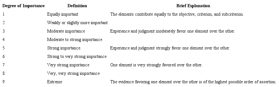 Comparative judgments: pairwise comparisons of the relative importance of the elements of a given level in relation to the level above, according to the AHP Fundamental Scale proposed by Thomas Saaty (Chart 1). According to Costa & Belderrain (2009), although decision makers evaluate the same criteria and associate them to different weights, the information processing interaction can be obtained in a globalized manner. By attributing to the criteria weights that represent a consensus of value for the group by means of an open discussion, each decision maker can analyze the problem separately, according to their specific point of view and interest, and then aggregate the information.