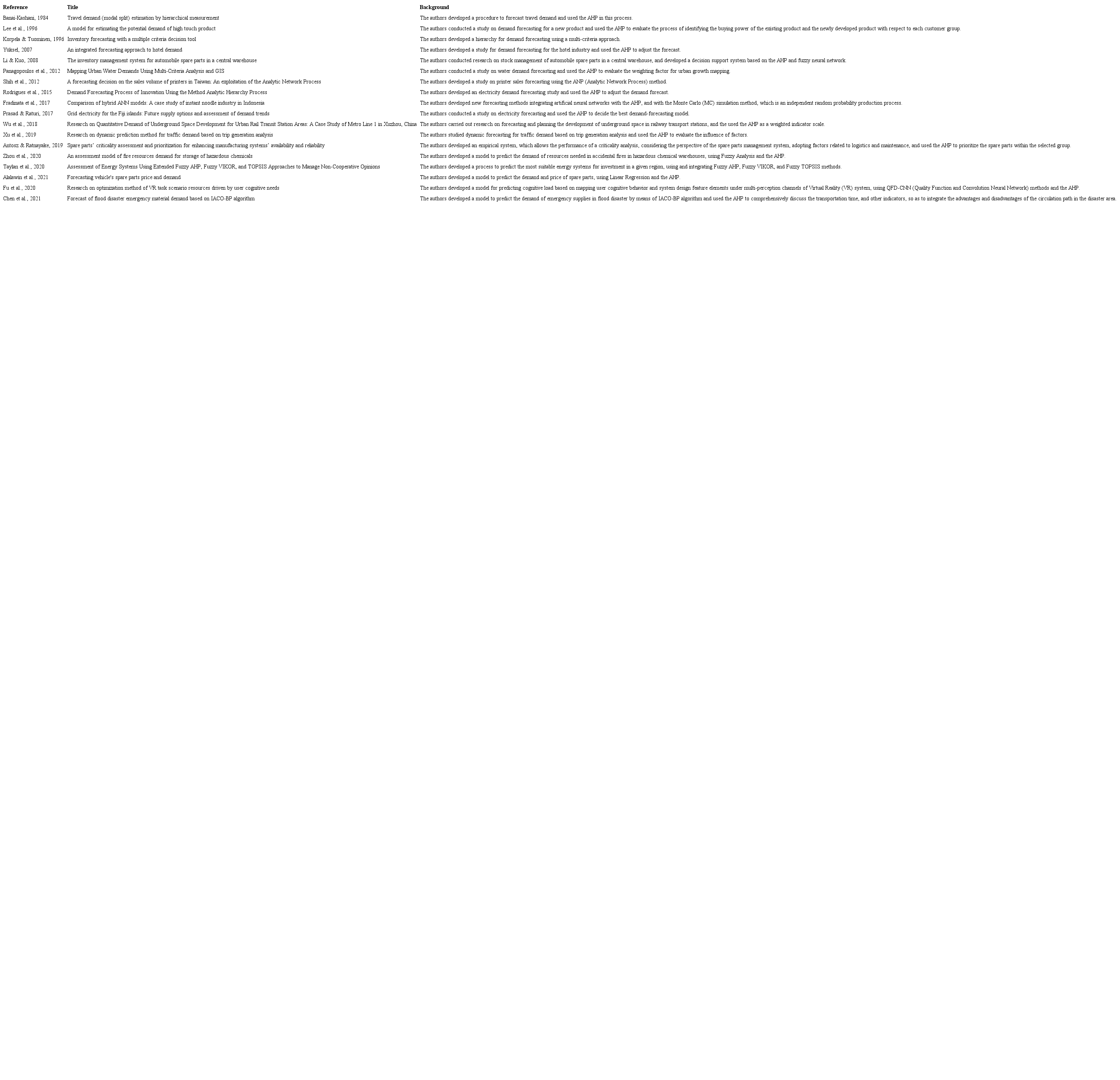 66.67% of the forecast studies applied the AHP in some stage of the demand forecast study as a support for decision making. One can highlight that the AHP was used for: identification, weighting and prioritization of information, product classification, and for the selection of the best forecasting model. The main applications of AHP were forecasting for: travel, water, electric power, traffic, underground space development, resources needed for chemical fires, spare parts and printers.