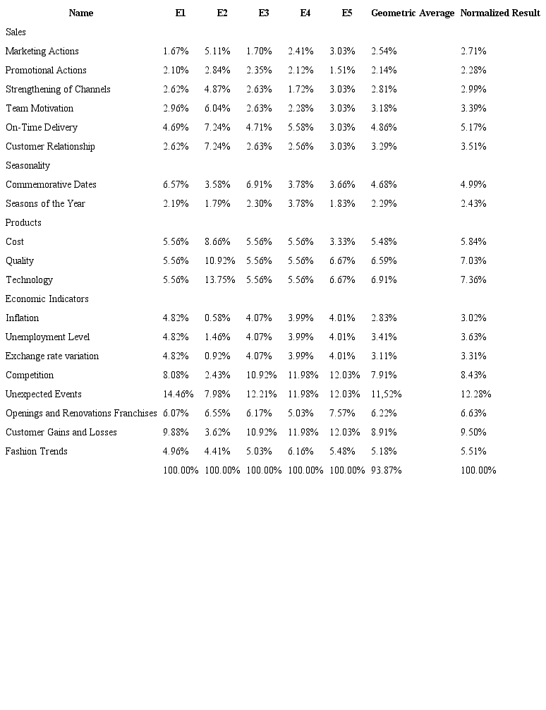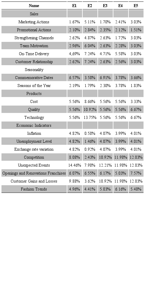 Of the thirteen specialists who participated in the brainstorming, five were considered as decision makers (E1 - sales analyst, E2 - PPC coordinator, E3 - general commercial manager, E4 - retail sales manager, and E5 - superintendent director) able to perform the “pairwise comparisons”. This process was performed in the software “Super Decisions®”. In order to do that, a structured individual interview was conducted with each decision maker.