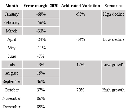 To adjust the demand forecast with the AHP, the first step was to evaluate the forecast error margins to determine the “arbitrated variation”. Thus, the margins of error of 2020 forecasts for product B were calculated, to then calculate the arbitrated variation. To do this, we obtained the average percentage of the 3 months with greater errors for more, and the average percentage of the 3 months with lesser errors for less, as well as the averages for the quarters with intermediate percentages (for less and for more), as presented in Table 4. The arbitrated variations (VA) are the demand growth rates established for the possible scenarios: high growth (70%), low growth (17%), high decline (-53) and low decline (-14%).