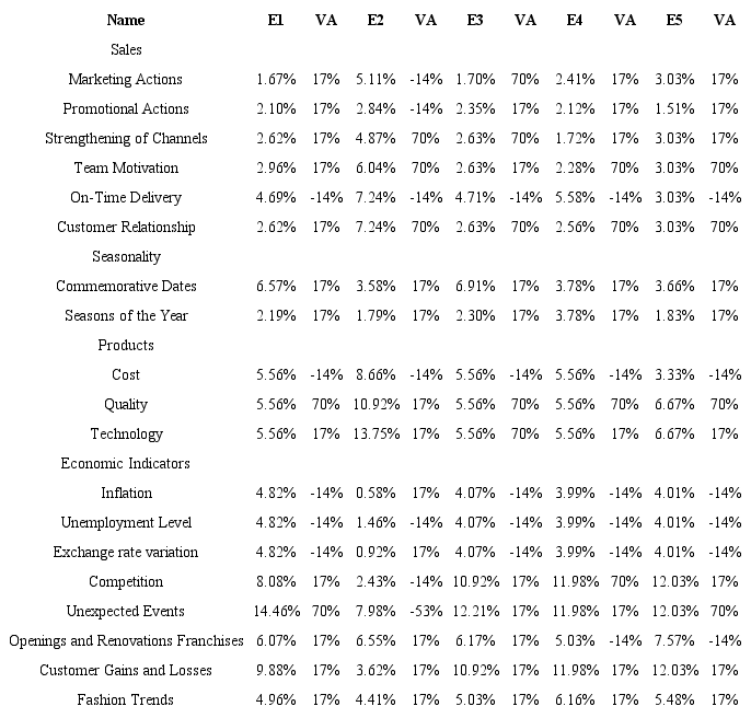 Next, the specialists were consulted to classify the factors according to the possible demand growth rates (high growth (70%), low growth (17%), high decline (-53%) and low decline (-14%)), that is by the arbitrated variation (VA). This process was done monthly, with the same priority ranking obtained with the method, alternating only the demand scenario from one month to the next. Table 5 presents the arbitrated demand variations for each specialist for January.