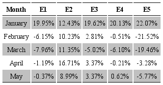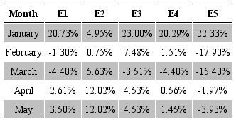 With the second model, the adjustment for January reduced the forecast error by 17%, considering the smallest margin of error with specialist “E3”. In February, the adjustment reduced the forecast error by 21%, considering that expert “E5” had an error margin of -5% in relation to the actual sale. It is worth pointing out that specialists “E2”, “E3” and “E4” had a margin of error larger than the initial forecast. In March, the proposed method reduced the forecast error by 29%, considering the smallest margin of error obtained with “E5” expert, and “E2” had a margin of error larger than the initial forecast. In April, the proposed method reduced the forecast error by 2%, considering the smallest margin of error obtained with expert “E5”. The other experts had a larger error margin than the initial forecast. In May, the proposed method reduced the forecast error by 5%, considering the smallest margin of error obtained with “E5” expert, while the other experts had a larger margin of error than the initial forecast.