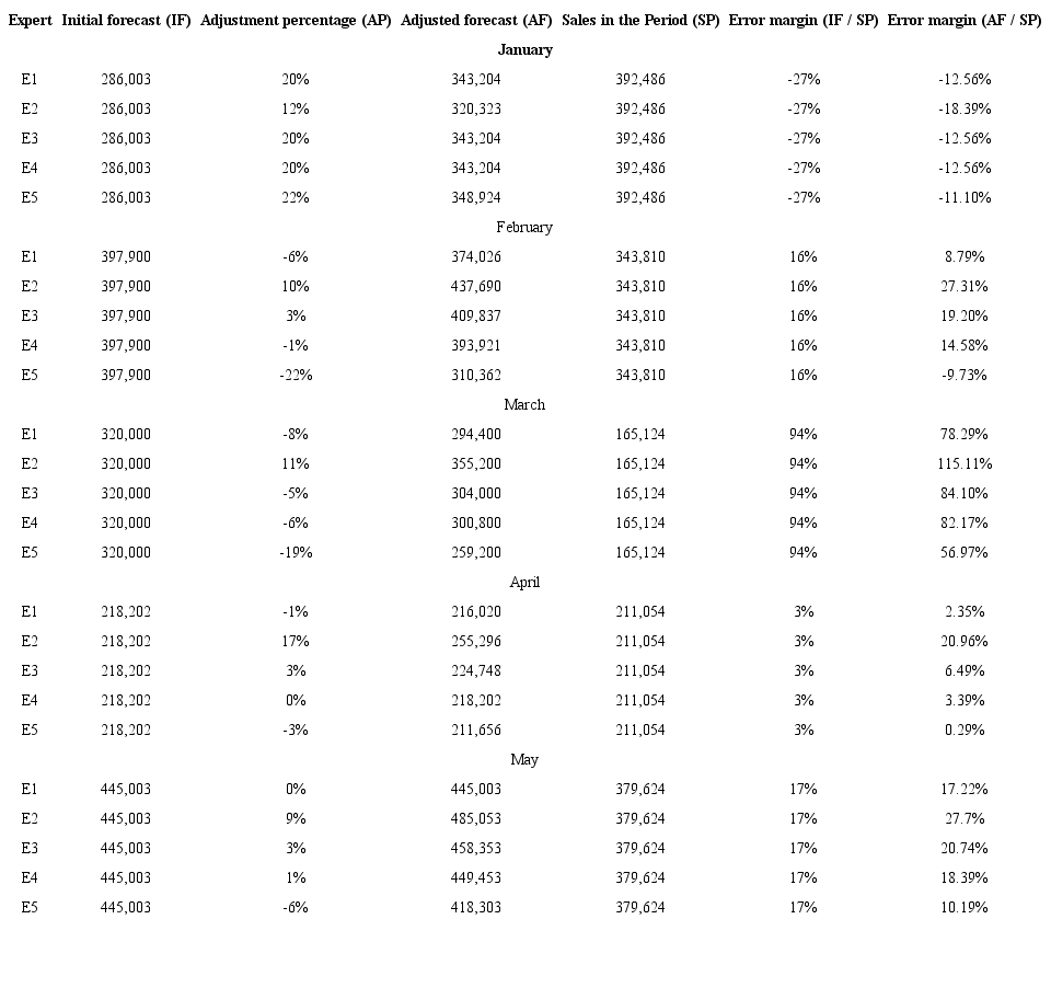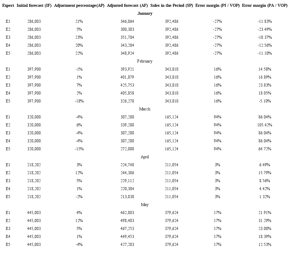 by 16% (difference between the error margins of the initial forecast (IF) and the adjusted forecast (AF)), considering the smallest margin of error obtained with expert “E5”. In February, the initial forecast was 16% higher than the actual sales. With the adjustment provided by the proposed method, the forecast error could be reduced by 25%, considering the smallest margin of error obtained with expert “E5”. It is worth noting that the experts “E2” and “E3” obtained a margin of error higher than the initial forecast. In March, the initial forecast was 94% higher than the actual sales. The adjustment provided by the method reduced the forecast error by 37% using the smallest margin obtained with “E5” expert. In April, the initial forecast was 3% higher than the actual sales. The error was reduced with the adjustment provided by the method by 3% considering the smallest margin with expert “E5”. Experts “E2” and “E3” obtained a margin of error larger than the initial forecast.