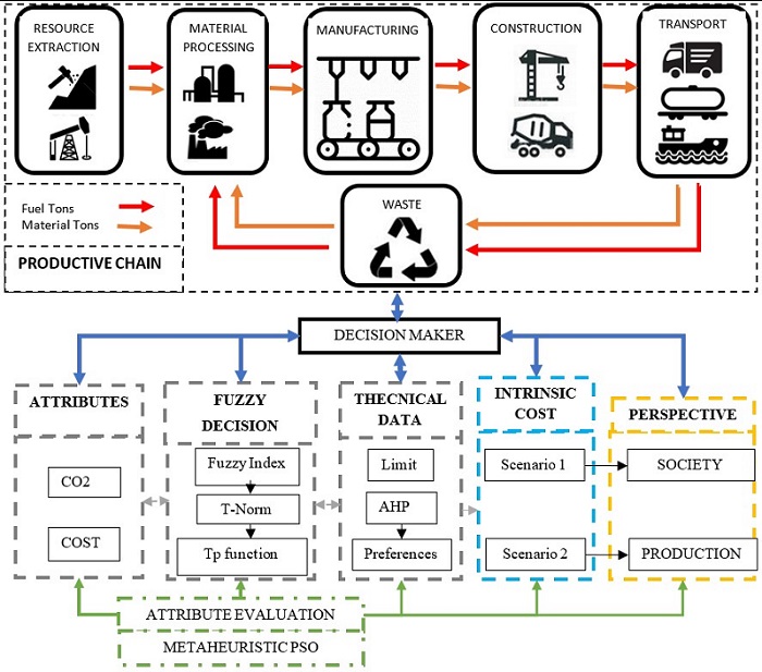 The decision-maker then evaluates the resulting LCA energy balance indices (emissions and investment cost), and he transforms them to the fuzzy domain taking into account upper and lower limits obtained from extreme LCA analyses. This is by determining the efficiency index to be optimized (fuzzy intersection). Based on the production chain model (LCA model), the attributes to be evaluated (investment cost and emissions) are established. Additionally, the preferences (AHP) and upper and lower limits (statics) of these attributes are established. From there, the evaluation of the indices is carried out, which also depend on the sense of improvement of the functional (growth or decrease).