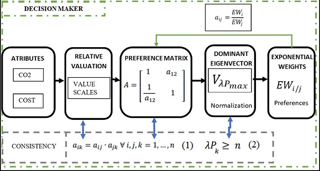 From this matrix, the Perron eigenvalues and eigenvectors are obtained. There is perfect consistency if these eigenvalues are worth the order of the matrix (n). Otherwise, they must have at least that value. From these consistency criteria, other consistency indices are proposed (consistency condition (2)), which ensure compliance with the axioms in the weighting of attributes, according to decision theory (transitivity, completeness, asymmetry and difference symmetry). The alteration of this matrix causes it to lose coherence (consistency), with less compliance with the aforementioned axioms. The indexes that measure this consistency are called consistency indexes. This alteration can be made to make preferences more flexible (Exponential Weights or EW), in case a laxer decision maker is sought, at the cost of losing consistency in his decision making. For more details on this, the following references present more information on this (Saaty, 2003; Schweickardt & Miranda, 2009; Camargo, 2019; Liu et al., 2020).