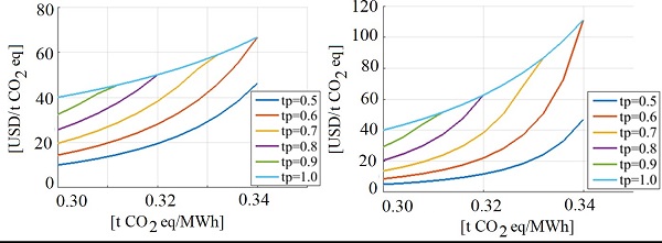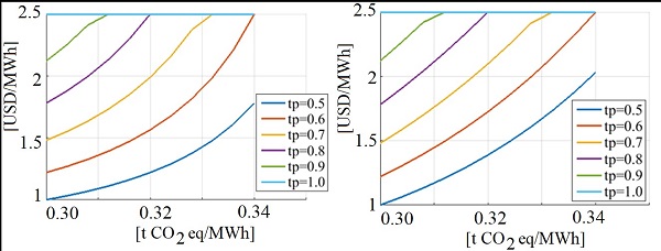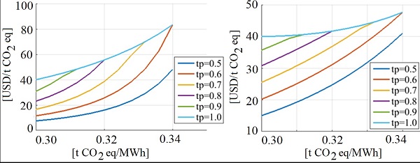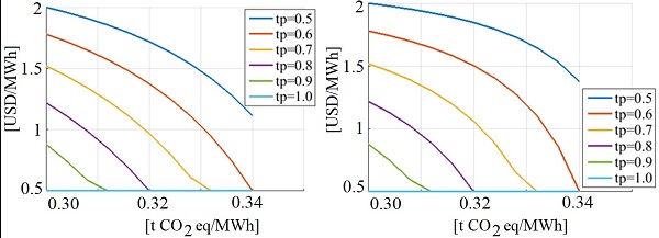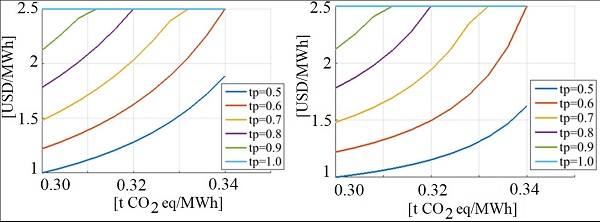 First, we analyse the case of a decrease in emissions while the cost of investment in the Argentine production chain increases. This is a case of positive externality from the production chain to the users, since the investments made favor society with a reduction in emissions. The effect of quality variation is presented in Figures 3 and Figure 4. This represents the variation of the proposed requirement limits, which means that if an index worsens, it is more difficult to compensate it. The costs per MWh obtained are in accordance with those established by the Argentine Renewable Energy Chamber and the Ministry of Energy (Argentina, 2022): renewable projects cost around .